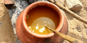White Makkhan is then heated on slow fire in a clay pot, what remains is pure, fragrant, liquid gold — authentically made – A2 Desi Cow Bilona Ghee.
