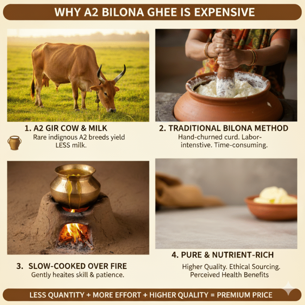 WHY A2 DESI COW BILONA METHOD GHEE IS SO EXPENSIVE AND PUREST FORM? August 9, 2025 1 Comment It takes 30-35 liters of milk to produce just 1 liter of Ghee. In summer, it’s even harder toextract ghee, Read More »